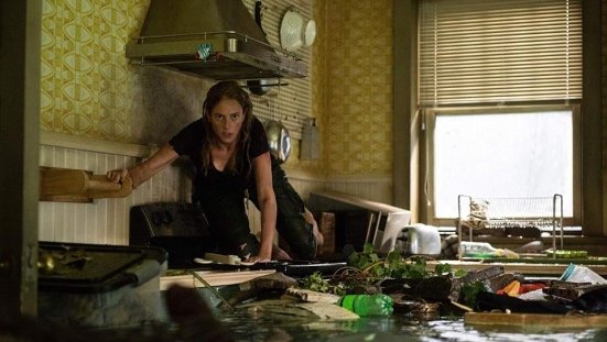 It’s hurricane season in Florida (also in real life) and young swimmer Haley (Kaya Scodelario) goes to check up on her estranged dad (Barry Pepper) who may be trapped by the floodwaters. She finds him in the basement where’s he’s been doing something, and an alligator pops out to get ‘em. And that’s about it. They get bitten, limbs are torn off, but they still manage to swim around and climb ladders. So much for a bit of realism.