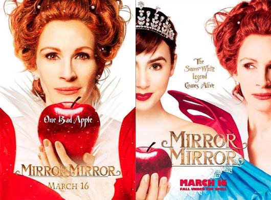 Snow White and the Huntsman (2012) – with Twilight’s Kristen Stewart as Snow, Charlize Theron as the evil Queen and Chris ‘Thor’ Hemsworth as the Prince – is a much darker and more action-packed take on the original while Mirror Mirror (2012) – with Julia Roberts as the Queen and Lily Collins as Snow White – seems to keep some of the fairytale charm of the original while being an adventure comedy movie. We also have two extremely different visual styles (Mirror Mirror being directed by Tarsem Singh, so that’ll be interesting) for both movies as you can clearly see from the posters and trailers.