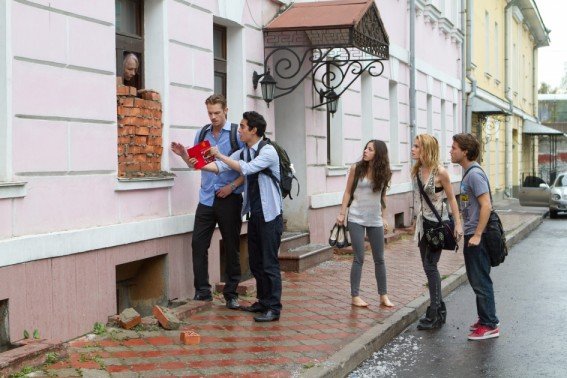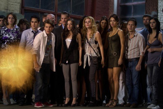 Our witless heroes Sean (Emile Hirsch) and Ben (Max Minghella) are partners in a doomed startup traveling to Moscow for their big meeting. But unfortunately they get conned (it’s business after all) and soon after they hit a bar and meet some pretty young American tourists (Olivia Thirlby and Rachael Taylor) the world is attacked by glowing balls of glittery fire that disintegrate people into a magical dust. But the balls can’t see them hiding in the basement of the bar. And it can’t see them when they hide behind glass. And the balls while electromagnetically ‘frying’ all electricity on Earth, unwittingly set off light bulbs and other gadgets when they pass by. Something that tips off our frankly dope head gang of ‘survivors’ so they all carry around lightbulbs!
