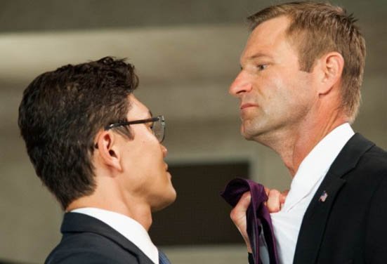 - Actors Rick Yune as Kang and Aaron Eckhart as President Asher in the movie Olympus Has Fallen