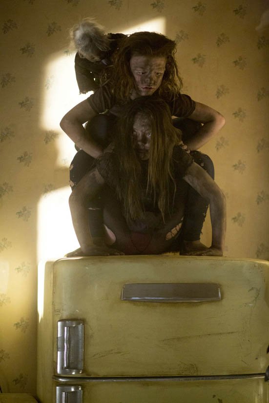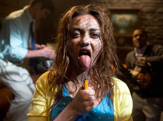 We do, to Dan Sanders (Simon Rex) and his wife Jody (Ashley Tisdale) who adopt Dan’s brother’s wild child kids who have been raised by a ghostly mother. A parody of producer Guillermo Del Toro’s less-than-chilling MAMA. This part is nicely done in its imitation. Then of course you can’t get away from Paranormal Activity. Which in Scary Movie 5 is basically the time indicator on the camera and a Rec light and time-lapse frames. The other movies that get parodied are: Sinister (far from scary, even the original isn’t), Rise of the Planet of the Apes, Black Swan (this parody is a bit fun), Cabin In The Woods and Inception (how is that a scary movie?).