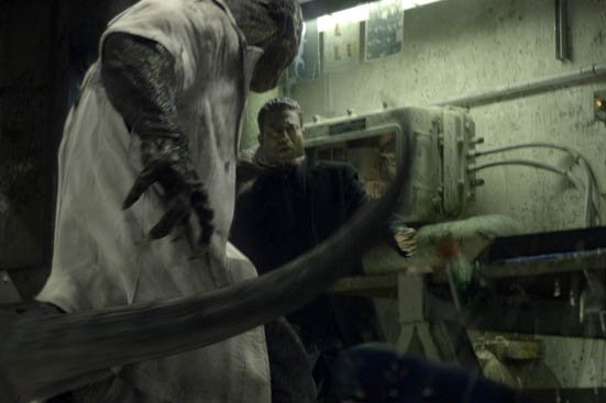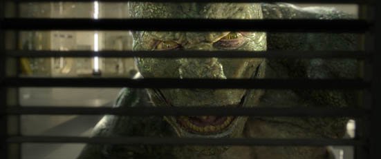 The Lizard is just a CGI character just as Spider-Man is in most of the action scenes. And a CGI character that looks like it’s from a well-made cartoon. What’s scary is that when Dr Connors first grows back his amputated arm with lizard mutated serum, the new slimy ‘hand’ looks like a prosthetic glove. Look closely, you can even see his actual hand inside the translucent flabby glove. Oh the music by James Horner does a lot to make this mediocre film look and sound relatively mysterious and dark.