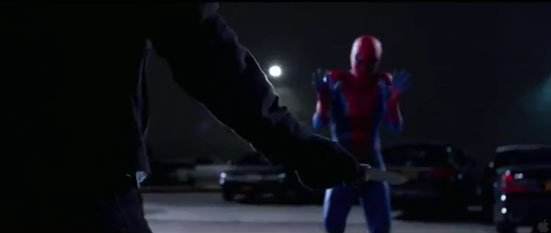4. Some unused production footage with blue screen and a scene where a mugger with a large knife tries to hold up Spider-Man. If you recall from one of the trailers, they actually use a take with the thief holding a smaller knife and Spider-Man drops to his knees and jokes: “You found my weakness, it’s small knives!”