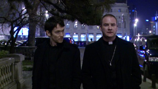 Because the film follows a strange format where it’s partly amateur hand-held camera footage, partly documentary footage where they appear to be interviewing members of the church and doctors and then it’s partly stupid too. At one point Isabella sits with this group of priests in a coffee shop after their exorcism class and tells them about her mother killing the priests. I turned to my friend sitting next to me and say “They’re never gonna wanna see her again.” And they all leave and say bye-bye! Okay I’m exaggerating. Two of the priests played by Simon Quarterman and Evan Helmuth do end up helping her but first they want her to witness a real life exorcism.