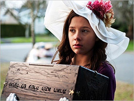 The film starts off with an elderly lady in a house who hears voices emanating from a box on her mantelpiece with strange inscriptions on it. When she tries to destroy it she is flung violently around the house. You know where this is going. A yard sale ensues and recently divorced basketball coach Clyde Brenek (Jeffrey Dean Morgan) and his two daughters Emily (Natasha Calis) and Hannah (Madison Davenport stop by to pick up some things for daddy’s new house in the middle of nowhere! Emily is drawn to the wooden box (why, you wonder, considering it looks pretty boring) and eerie music starts playing. You know where this is going too.